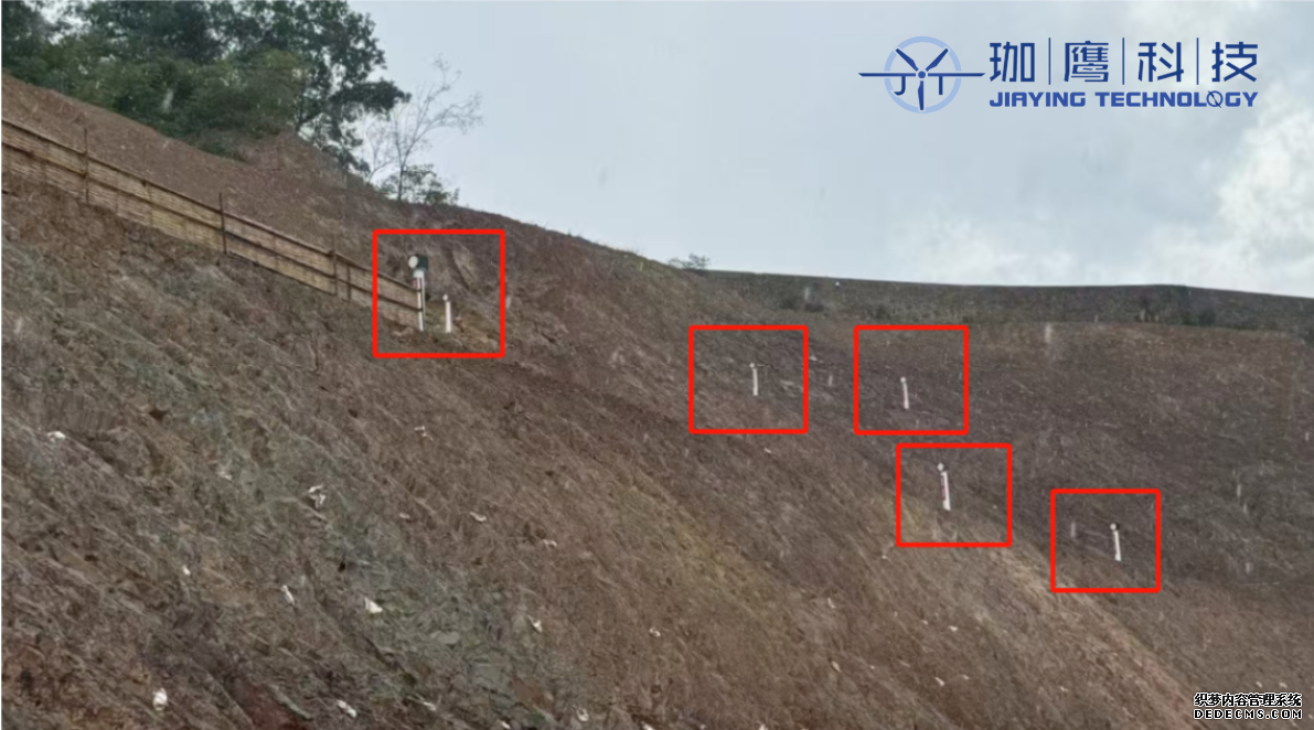 珈鷹的工作人員在滑坡的北部方向安裝了一臺AI視覺監測儀,用于實時監測邊坡的變形情況。在待監測的邊坡上,共布置了8個監測標靶,其中上級馬道布置了4個標靶,下級馬道布置了4個標靶。此外,在滑坡南部上級馬道的穩定巖石上布置1個基準標靶,作為監測的參考基準點。